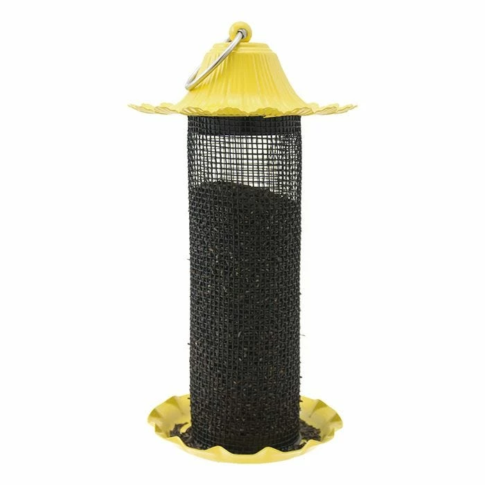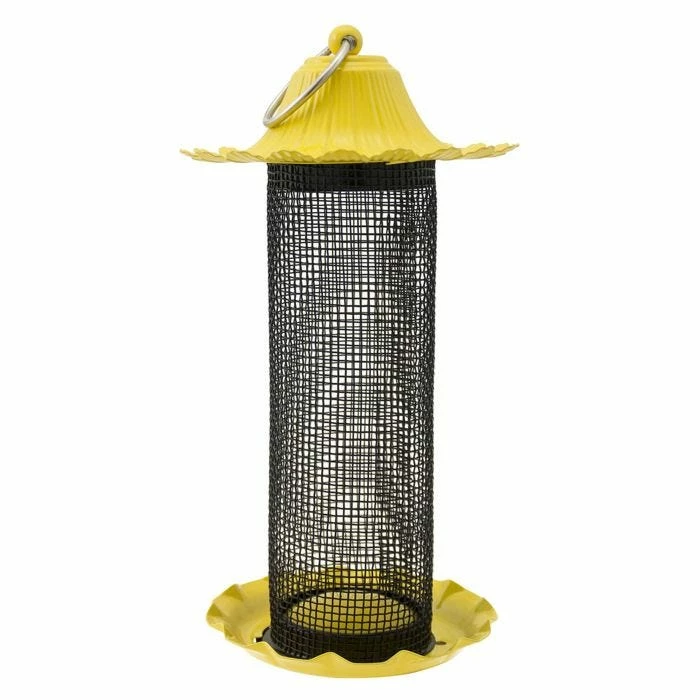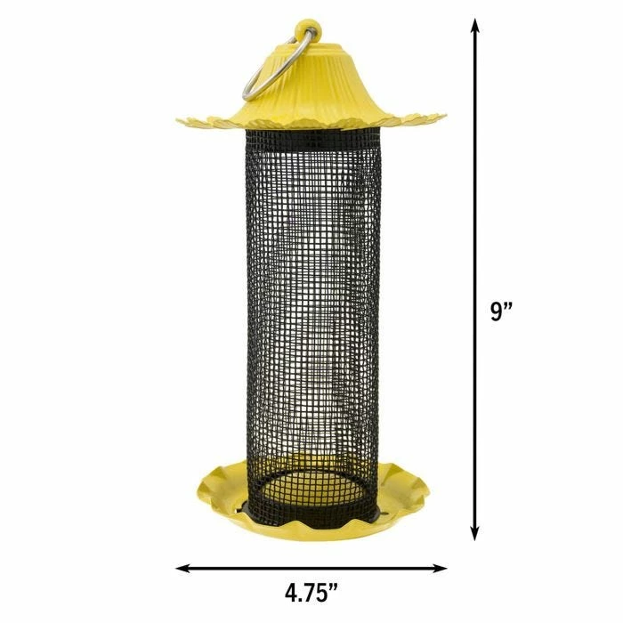 design keeps seeds moving into feeding areas. With a decorative flower top design and yellow powder-coated finish