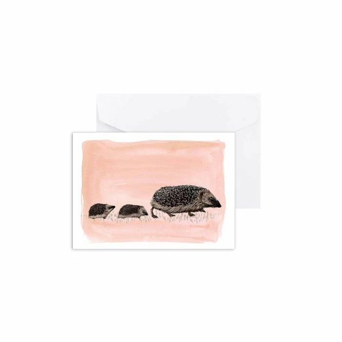 Our range of greeting cards is created by the Dutch naturalist Myrte, and this is a stunning illustration of a mother hedgehog, caring for her two children on a pale pink background.