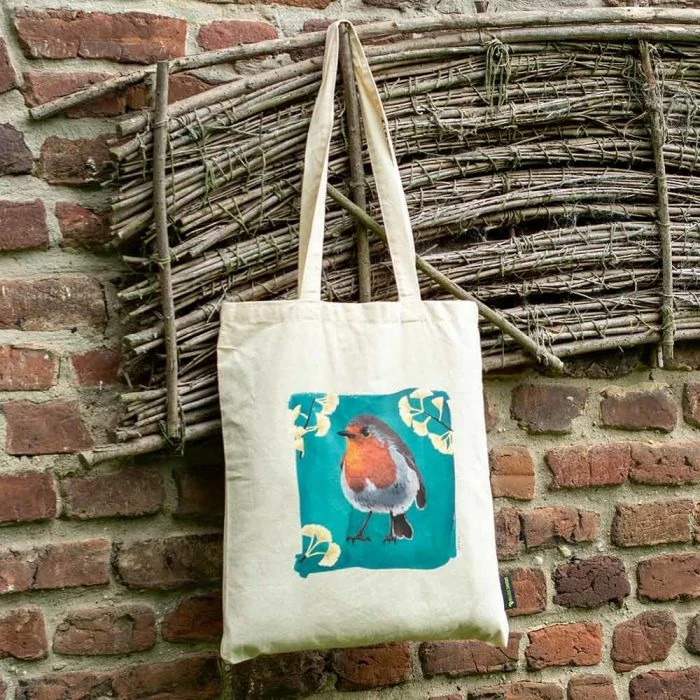 Practical, foldable bag with shoulder straps.ย The robin, drawn by Myrte, makes this bag a real eye-catcher.