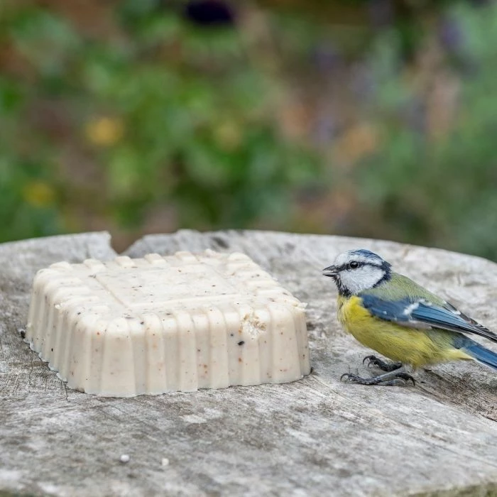 The cakes are popular with tits, finches, woodpeckers, Nuthatches, Treecreepers, Goldcrests and Robins. These cakes can be fed either from a hanging or pole-mounted feeder, or chopped up on a table. They can also be chopped into small pieces (1cm cubes) and scattered around the edge of your feeding area to give smaller and more timid species (such as Dunnocks, Wrens and Blackbirds) a chance to enjoy them.