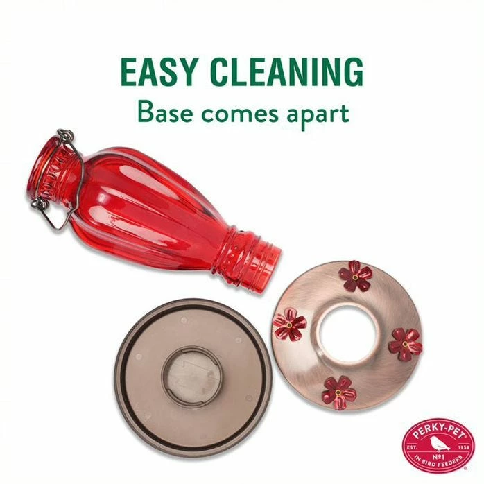 The thick, red glass jar of the Perky-Pet® Red Antique Glass Bottle Hummingbird Feeder is durable enough to withstand tough weather without breaking. Meanwhile the metal base cover and ports ensure this feeder will be a focal point in your backyard for a long time to come.