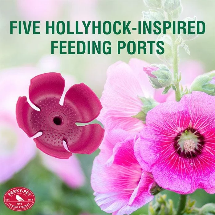 Hummingbirds are accustomed to imbibing nectar from flowers. That’s why we’ve developed this feeder with soft, flexible feeding ports inspired by the hollyhock flower to offer a more natural look and feel. The vibrant color and realistic flower shape are perfect for attracting hummers, while the five ports ensure there’s enough room for multiple birds to dine simultaneously.