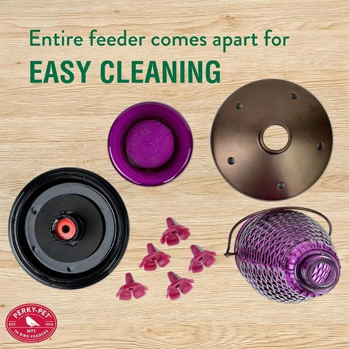 Hummingbirds prefer to visit fresh, clean feeding stations. To make that easier, this feeder disassembles for effortless cleaning. Easily separate the base, bottle and lid. You can even pull apart the base and remove the feeding ports! Remember to clean your feeder at least once per week with a mild soap and water solution to prevent mildew buildup; clean more often in hot weather.