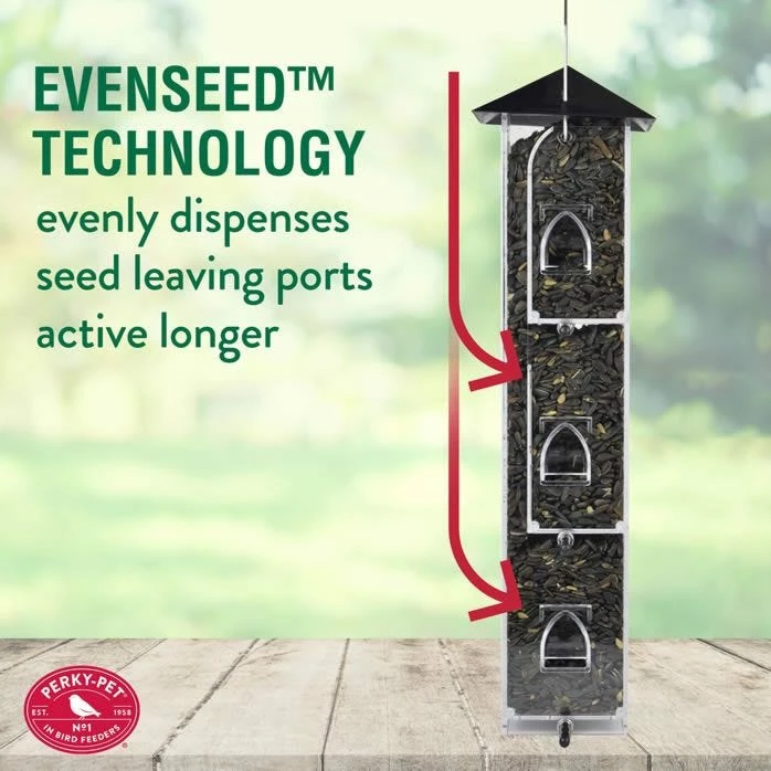 Birds won’t be able to resist flocking to the Perky-Pet® Evenseed™ Silo Feeder! It features six feeding ports paired with comfortable perches evenly spaced around the reservoir so multiple birds can dine at the same time, and you can enjoy a better view. In addition, the feeder’s Evenseed™ Technology allows seed to be evenly dispensed in each compartment. As one compartment runs out, birds can simply move to another perch where seed is still flowing.