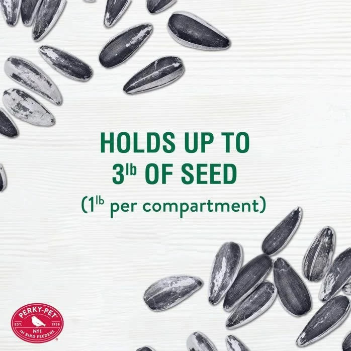 The Perky-Pet® Evenseed™ Silo Feeder features three separate seed compartments, allowing you to serve up to three different types of seed at once. It’s like having three feeders in one! By offering a larger variety of seed options, you’ll easily be able to attract a wider array of your favorite bird species to the same feeder.