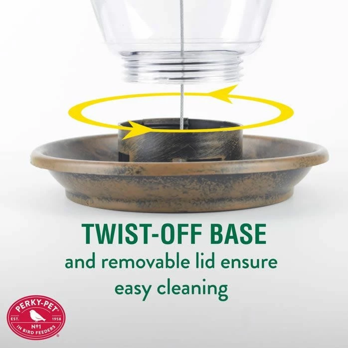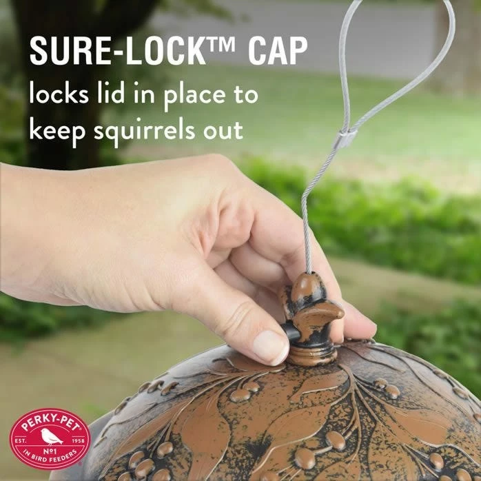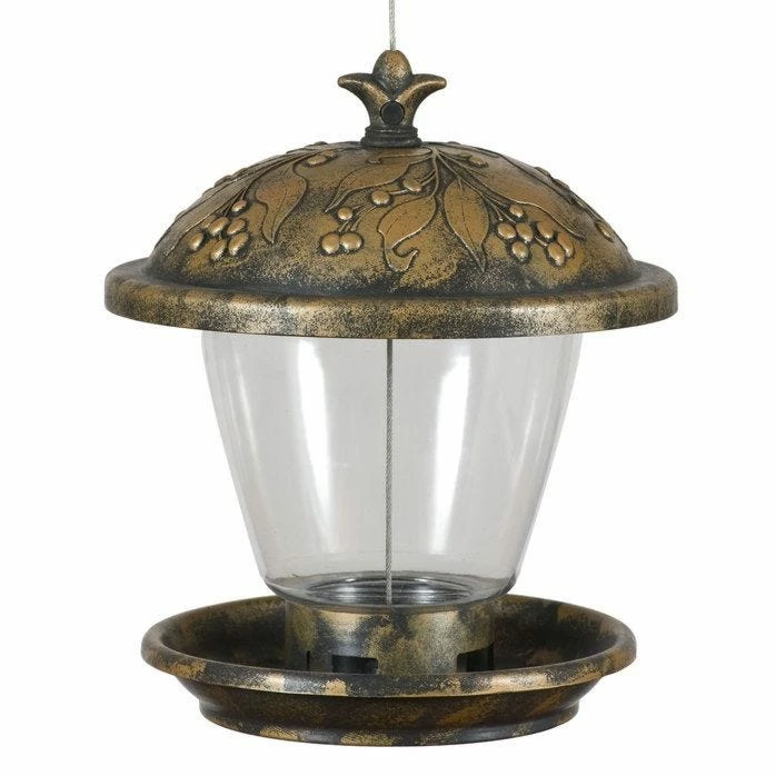Treat your feathered friends like the treasured visitors they are by adorning your garden with this Perky-Pet® Holly Berry Gilded Chalet Bird Feeder. The 360-degree seed tray gives you and your feathered friends a great view. An embossed holly-berry pattern on the lid is beautifully complemented by an antique-gold finish that lends a charming visual accent befitting of your distinguished guests. The Sure-Lock™ cap locks the lid in place to keep unwanted visitors out of the reservoir. You’ll have no trouble removing the bird feeder’s lid and twisting off the base for hassle-free filling and cleaning.