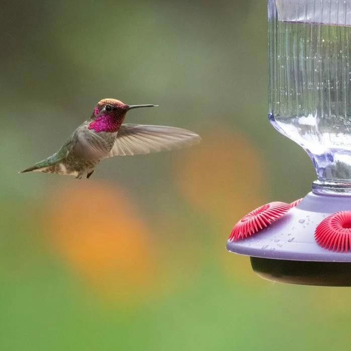 Presenting the patented Top-Fill bottle you love with a show stopping new color and glass design, the Perky-Pet® Lavender Field Top-Fill Glass Hummingbird Feeder is a favorite of birders and hummingbirds alike. The wide-mouth opening and Top-Fill design ensure that filling is always easy and mess-free! While you enjoy time saved from filling and cleaning, your hummingbirds won’t be able to resist the feeder’s lifelike zinnia-inspired flowers. They are bright, soft and flexible just like the flowers they flock to in nature! The flowers’ long stem design also acts as a natural bee guard to keep bugs out. Find the best seat in your house now, because hummingbirds are sure to be on their way!