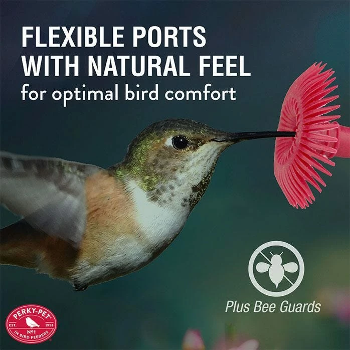Hummingbirds are accustomed to imbibing nectar from flowers. That’s why we’ve developed this feeder with soft, flexible zinnia-inspired feeding ports to offer a more natural look and feel. The vibrant red color and realistic flower shape are perfect for attracting hummers, while the five ports ensure there’s enough room for multiple birds to dine simultaneously.