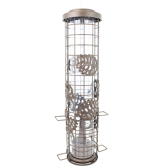 To offer defense against squirrels, this feeder boasts multiple great features. First, is the feeder’s weight-activated Seed Shield™, which is calibrated to support the weight of birds but not squirrels. When squirrels try to gain access to the perches, the cage closes off the ports under their weight. Birds can sit on every perch without activating it. In addition, the twist-lock cap prevents squirrels from lifting the lid, while the metal frame discourages chewing around the ports.