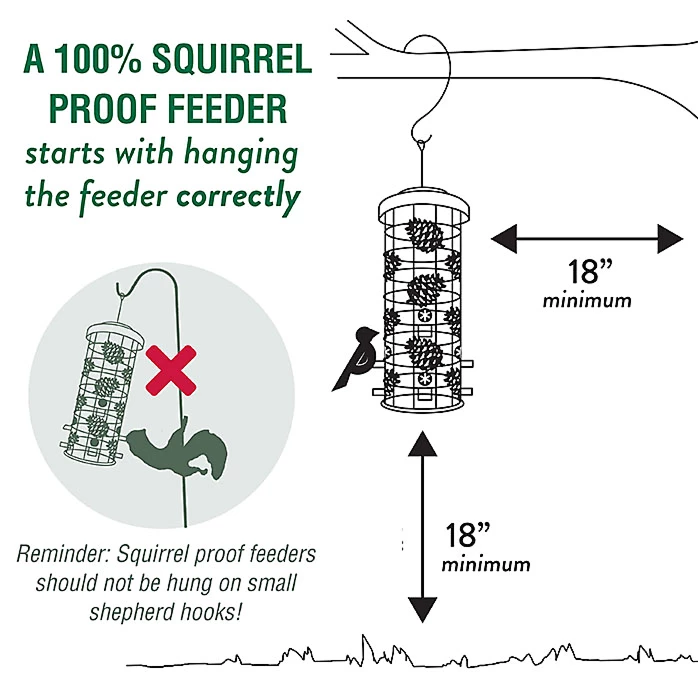 To ensure a 100% squirrel proof feeder, placement is key! Hang the feeder with at least 18 inches of clearance on all sides so squirrels can’t easily reach the ports without activating the Seed Shield™.