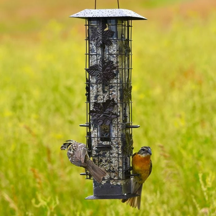 To offer defense against squirrels, this feeder boasts multiple great features. First, this feeder’s weight-activated system is calibrated to support the weight of birds but not squirrels. When squirrels try to gain access to the perches, the cage is pulled down, causing the decorative leaves to cover the ports. In addition, the metal cage prevents squirrel chewing and damage.