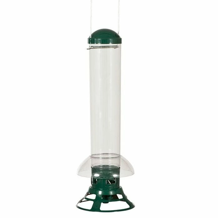 Rely on the strong, durable design of the Perky Pet® Squirrel Slammer Bird Feeder. Its simple design features a metal base and ports that are well constructed to prevent damage from squirrels, while the clear plastic seed tube holds up great to time and inclement weather. The sturdy metal handle allows fuss-free hanging from a variety of locations around your property.