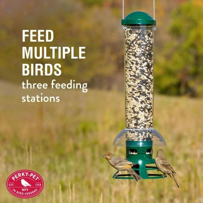 Three feeding stations let multiple birds enjoy dining at this Perky Pet® Squirrel Slammer Bird Feeder. The tube keeps the bird seed inside dry, while the clear cover provides shelter for your favorite backyard birds as they dine on the seed you provide. The roomy perches at the base let them relax and enjoy a meal from all angles while you enjoy their presence in your yard.