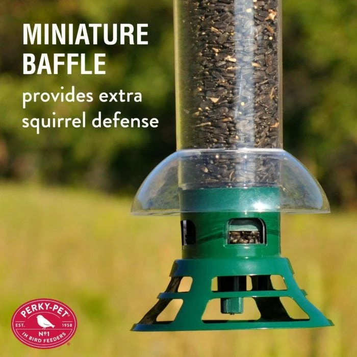 To offer defense against squirrels, this feeder boasts multiple great features. First, is the feeder’s weight-activated perch, which is calibrated to support the weight of birds but not squirrels. When squirrels try to gain access to the seed, the ports close off under their weight. Birds can sit on the perch without activating it. The sensitivity can also be adjusted to keep out larger nuisance birds. In addition, the miniature baffle provides an extra guard, while the metal frame discourages chewing.