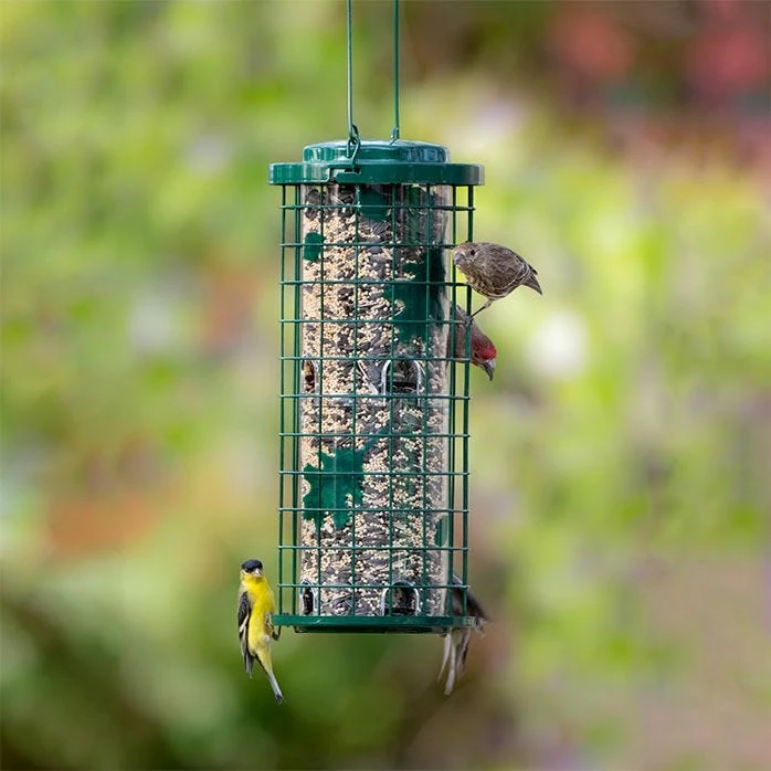 To offer defense against squirrels, this feeder boasts a few great features. First, is the feeder’s metal wire cage design. The cage creates a barrier around the ports which makes it harder for squirrels to access the seed. The cage is made of metal to prevent squirrel chewing and damage. This feeder also features a convenient twist-lock lid which prevents squirrels from easily opening the feeder and accessing the seed inside.