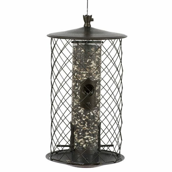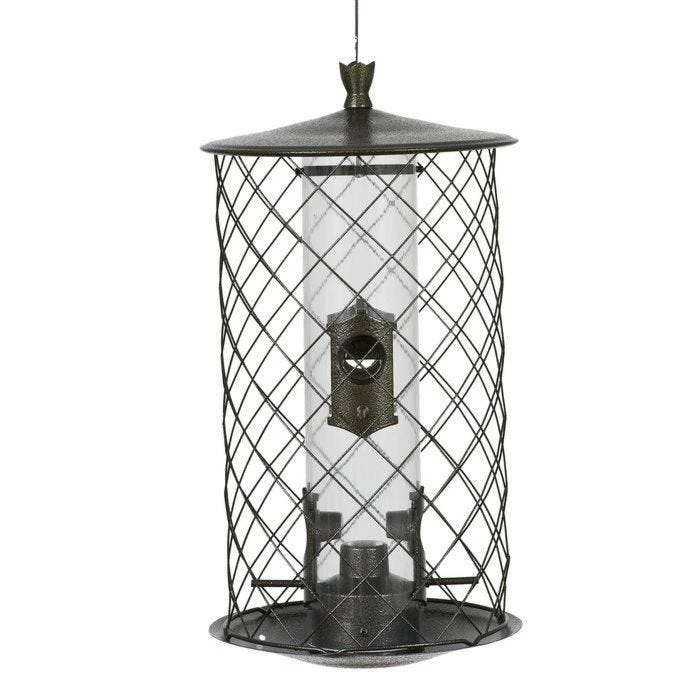 The Perky-Pet® The Preserve™ Feeder features a decorative metal top, feeding ports, perches and holds up to 3 lb of seed. The patented, diamond-shaped barrier allows birds in and keeps squirrels out. The clear, plastic reservoir makes it easy to monitor seed levels.