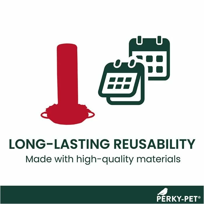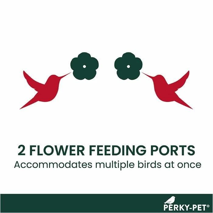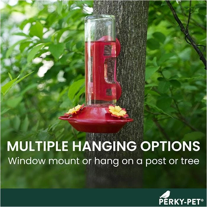 The Perky-Pet® Window-Mounted Glass Hummingbird Feeder features two ports with bird-preferred U-shaped perches. The vibrant red color and flower-shaped ports are perfect for attracting hummers, while the number of ports ensures there’s enough room for more than one hummer to dine.
