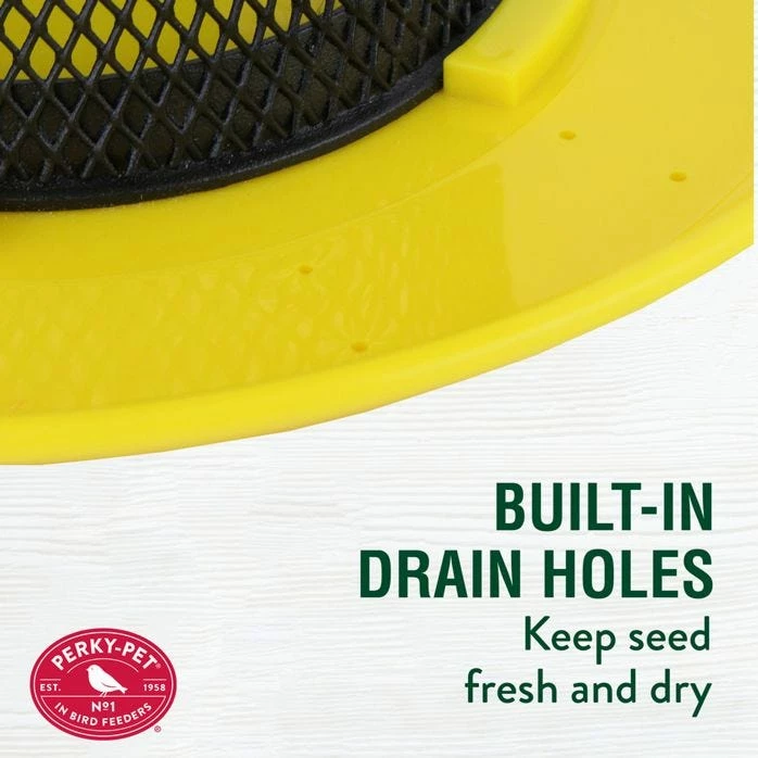 The Perky-Pet Yellow Finch Feeder is also easy to fill. Just press the Sure-Lock cap, which lock the lid in place, and slide off to remove. Thanks to this feeder’s built-in drainage holes, water is unable to pool in the reservoir. In addition, the mesh design provides ventilation so wet seed airs out quickly and remains fresh for longer. No more seed waste due to wet seed.