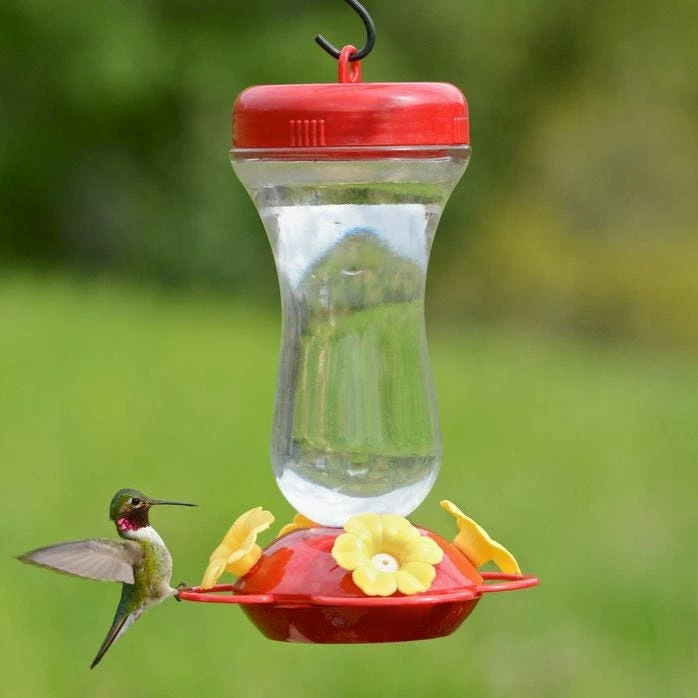 Hummingbird feeding is now easier than ever with the Perky-Pet® 16 oz Top Fill Glass Hummingbird Feeder. The patent pending technology behind this glass Top Fill Feeder allows you to simply open the cap, pour in the nectar, and you’re ready to go. Traditional bottom fill feeders only give you a small opening in the bottom of the feeder to pour your nectar, but the convenient wide mouth opening of this Top Fill safeguards against spilling while filling. Hummingbirds will be drawn to the four yellow, soft flower feeding ports. They are the most life-like flowers on the market. The built-in ant moat on the cap has the ability to be filled with water, blocking the ants from accessing the nectar.