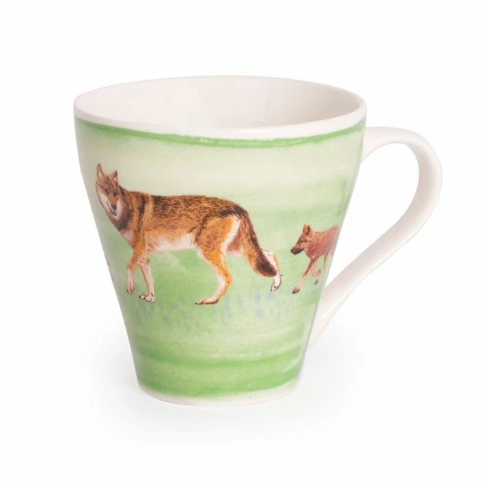 Bring nature inside with an exquisite mug from Myrte, the Dutch nature illustrator. This mug features a charming illustration of a wolf and cub against a pale green background.